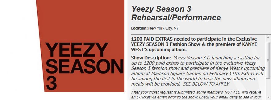 My Experience: If it wasn’t for my co-worker telling me about the casting, I would have never been in the show. She saw an ad for YzySzn3 casting extras to attend, and this is how it looked: